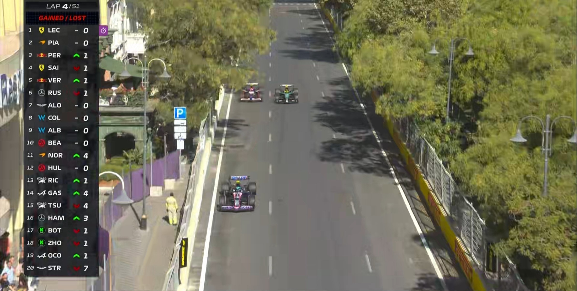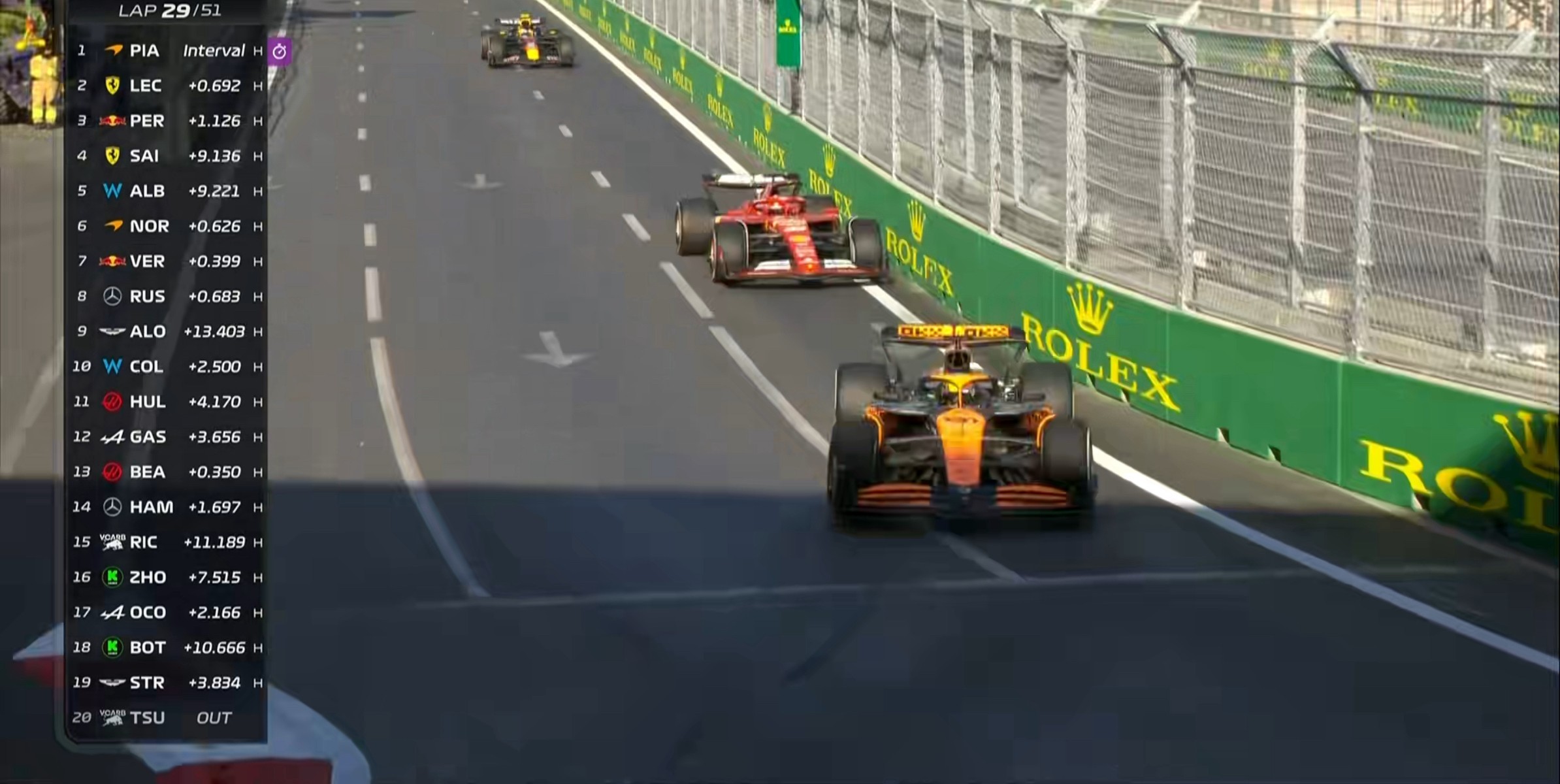 第29圈:佩雷兹逐渐掉出勒克莱尔的DRS区间,皮亚斯特里持续防守勒克莱尔!
