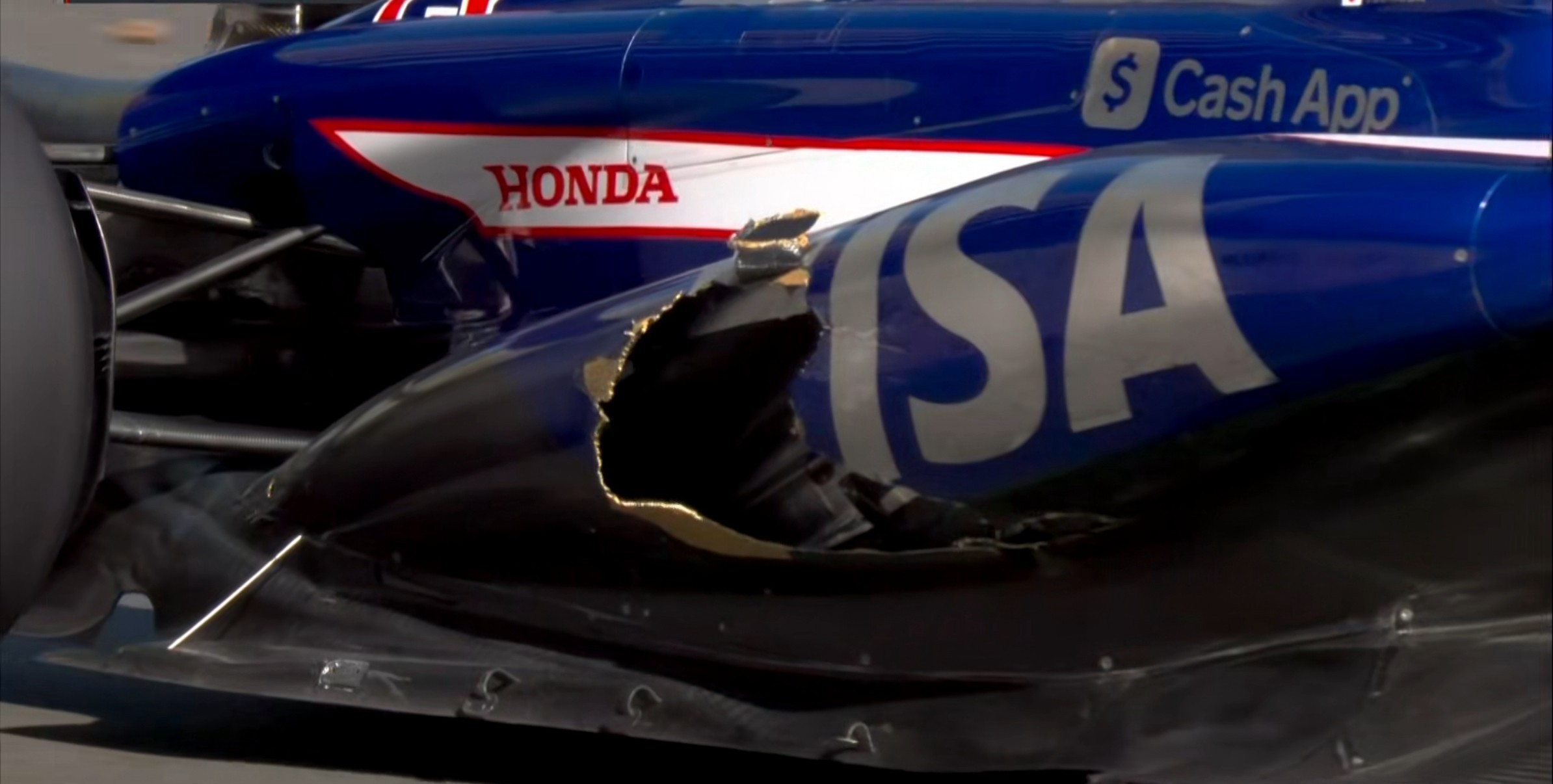 第16圈:角田裕毅连续第二场比赛DNF,可以看到他赛车的侧箱被撞出一个大洞!