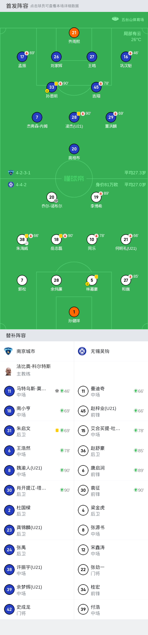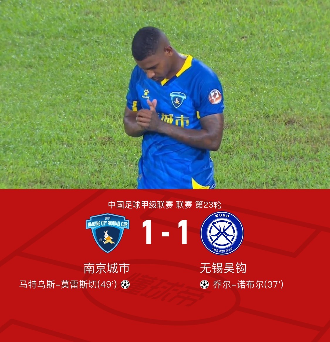 北京时间9月15日,中国足球甲级联赛第23轮,南京城市主场迎战无锡吴钩。比赛中,朱海威率先送出助攻,乔尔-诺布尔头球破门打破场上僵局,随后马特乌斯-莫雷斯切禁区内乱战中挑射破门将比分扳平,全场战罢,最终双方以1-1的比分握手言和。