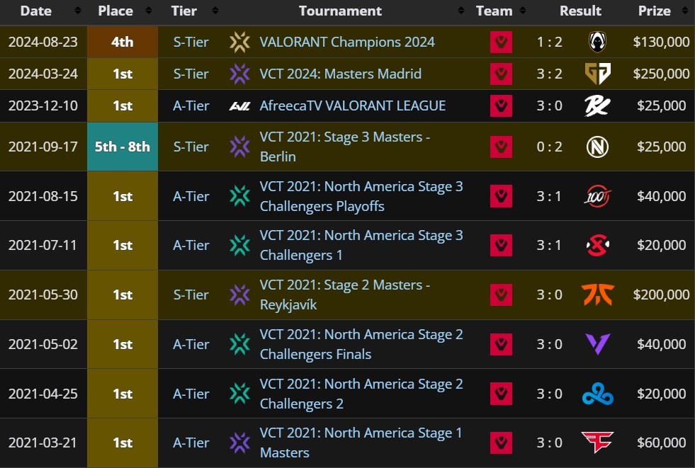 2024年3月,SEN问鼎了VCT巡回赛马德里大师赛,TenZ帮助队伍时隔三年再度站在世界之巅,他也成为了继Chronicle后,第二位获得两座大师赛冠军的无畏契约职业选手。