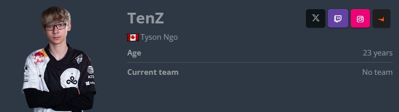 2020年4月,TenZ转投C9无畏契约分部,并于2021年4月被租借到Sentinels,并一直为SEN效力至今。