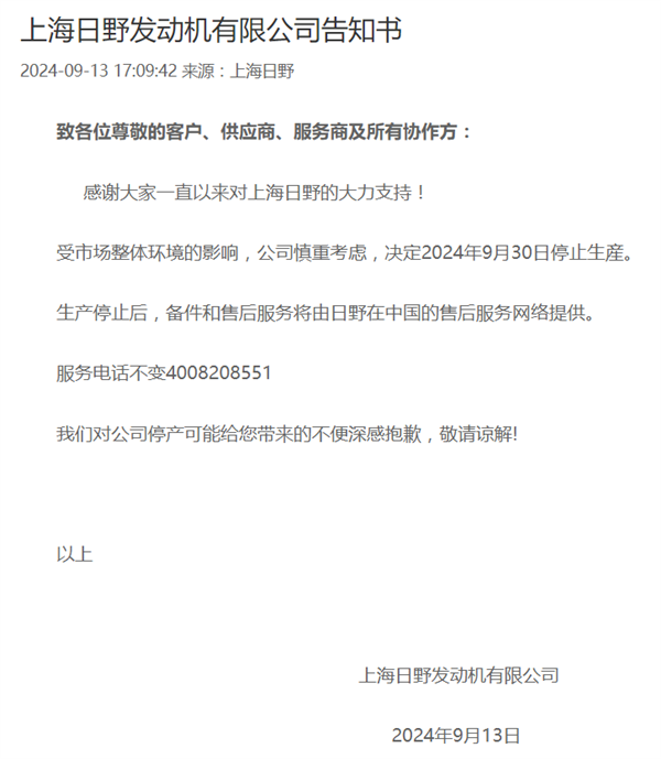 快科技9月16日消息,近日,由日野和广汽集团于2003年合资成立的企业上海日野发动机有限公司,宣布将于9月30日停产。