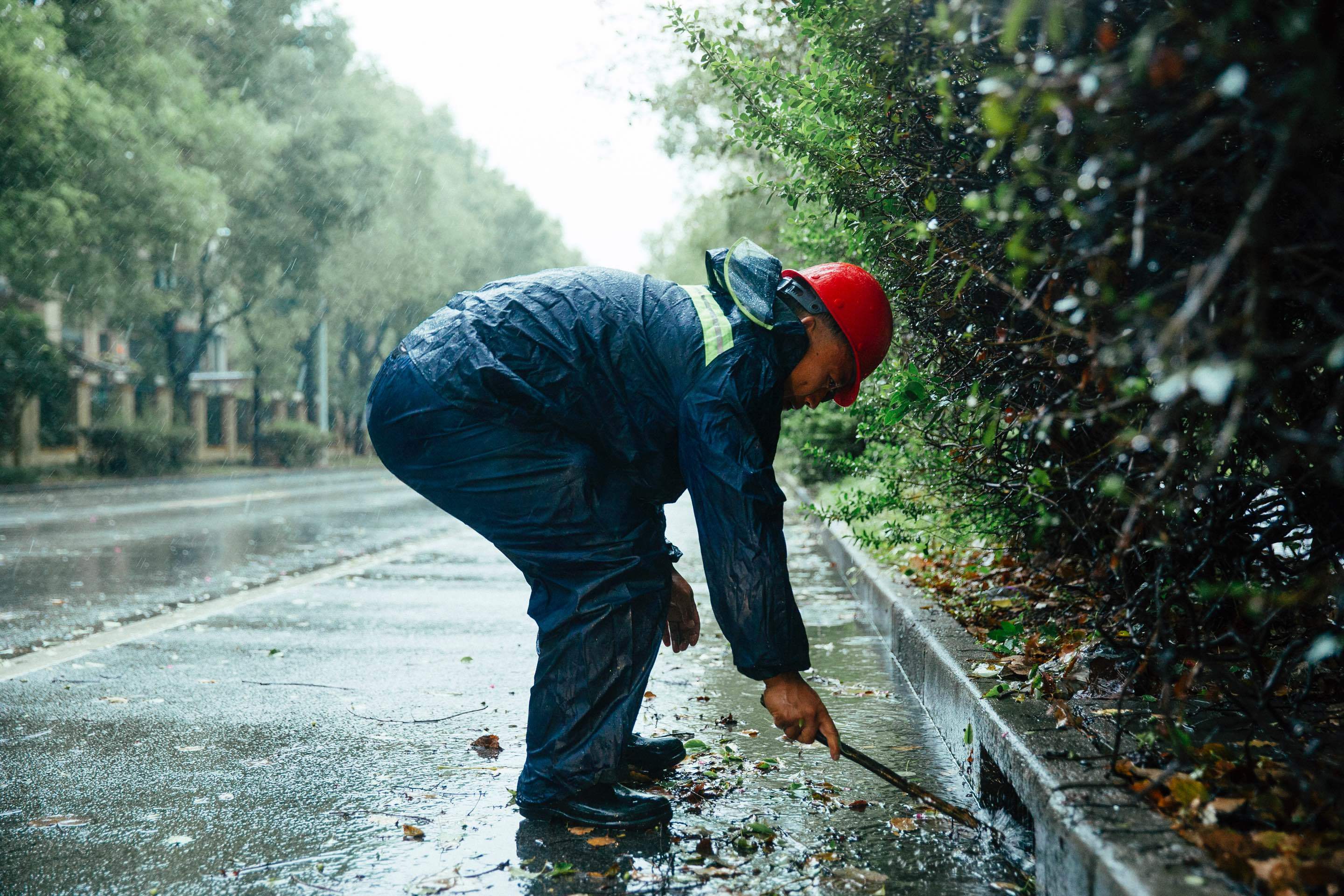 南翔路政的工人正在为低洼路段设置路障和清理排水口污渍