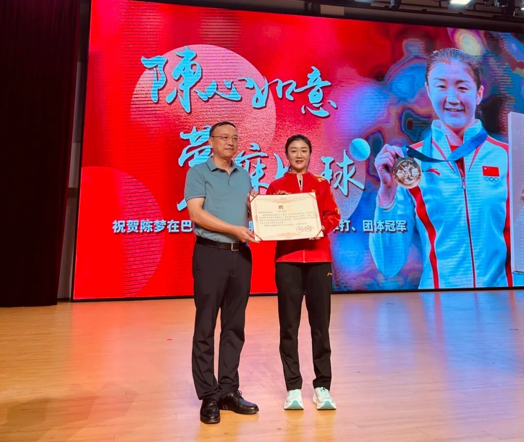 王金战对陈梦的到来表示欢迎,在热烈的掌声中,陈梦走上舞台,分享了自己的卫冕历程。陈梦说:“三年前,在陈梦(国科)乒乓球学校成立之时,我曾经对你们承诺,三年后的巴黎奥运会,我会努力为梦去拼搏!三年后的今天,比起那沉甸甸的两枚金牌,我更想说,我真的尽力了,我做到了!”