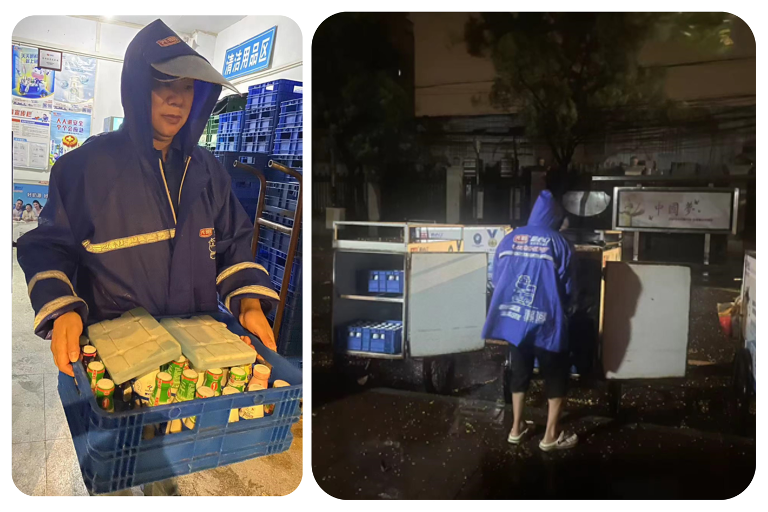 早在“贝碧嘉”登陆前,光明随心订就严阵以待,进行了周密安排。9月15日,各奶站全面检查了站内设施和用电设备,防止奶站内的物品被积水浸泡。9月16日凌晨3点,很多奶站里已经灯火通明——因为当时“贝碧嘉”的风雨影响相对较小,光明随心订决定将当日的送奶出发时间由往日的凌晨5点提前两小时,这个决定也得到了送奶员的支持。在确保道路等环境安全的前提下,奶站工作人员们将送奶员一一送出,叮嘱他们穿好雨衣,时刻注意天气变化与路况,如果遇到恶劣天气,可以与订户做好沟通,暂缓配送。