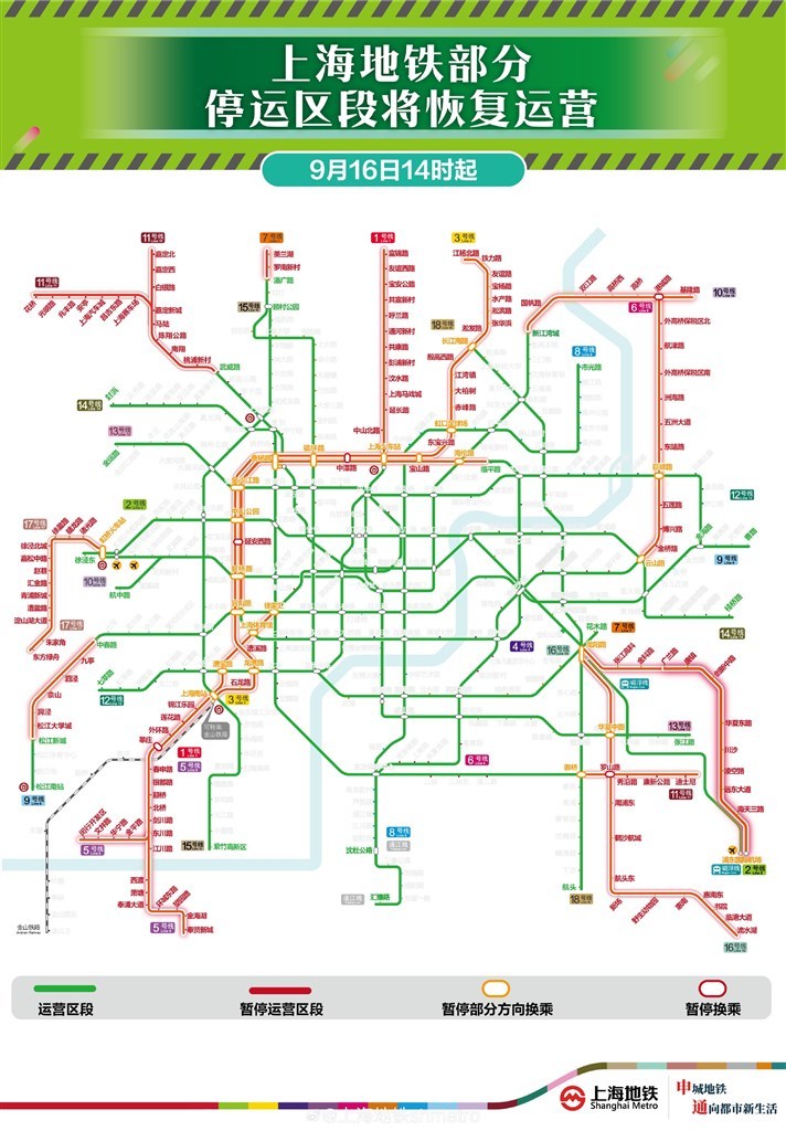 此外,上海地铁1号线、2号线、4号线、6号线、7号线、9号线、10号线、11号线高架地面区段及3号线、5号线、16号线、17号线全线,目前不具备运营条件,仍暂停运营。