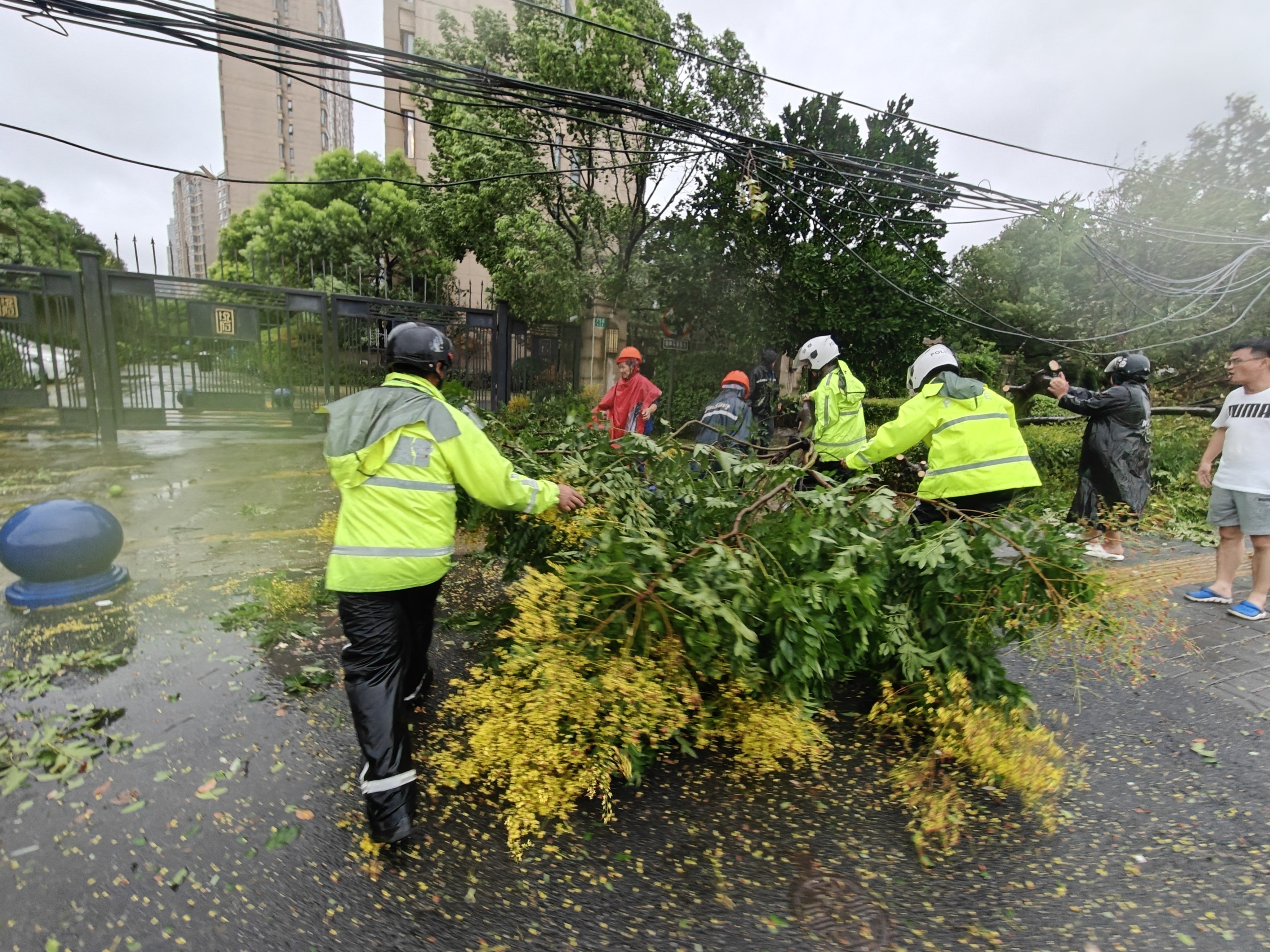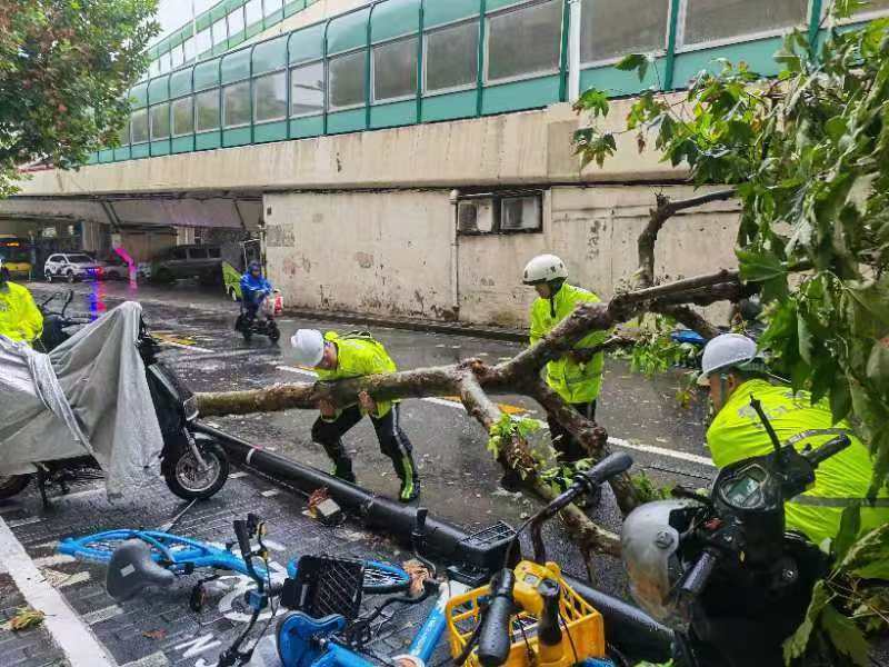 上午10 时许,静安区愚园路镇宁东路一侧树木倒伏影响道路通行,静安交警支队一大队民警张逸凡等迅速到达现场指挥车辆改道绕行。