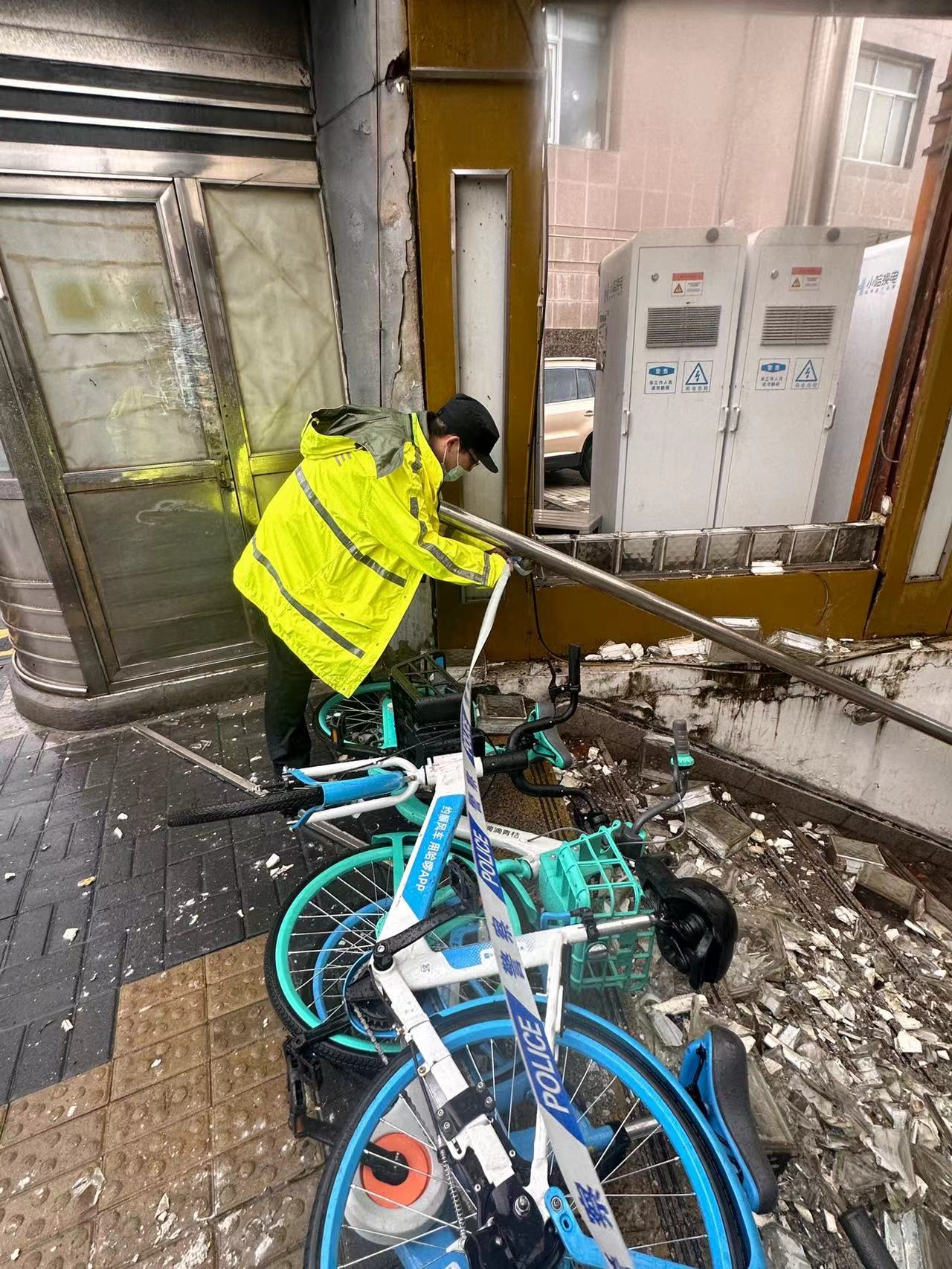 与此同时,北站派出所民警支伟民和旺久在巡逻时发现一地下通道的过道玻璃出现损毁情况。为保障行人安全,他们反应迅速,巧妙利用共享单车对通道进行临时封锁,及时消除了安全隐患。