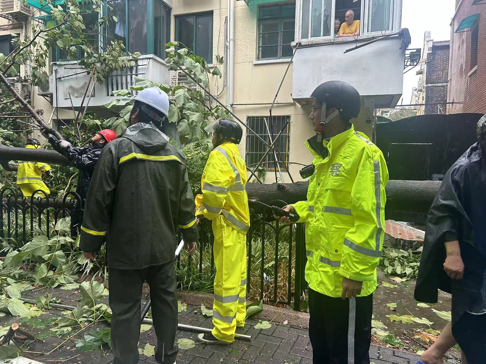 上午 9 时许,静安公安分局曹家渡所民警富丽君第一时间到达康定路某小区内树倒墙塌的现场进行处置。20分钟后,被大风刮倒的大树就得到清理,小区的现场秩序得以恢复。