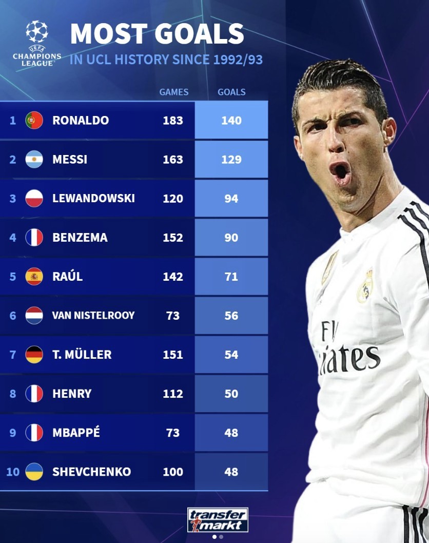 最近,德国转会市场列出了自1992/93赛季改制后的欧冠进球榜单,C罗打入140球居首位。