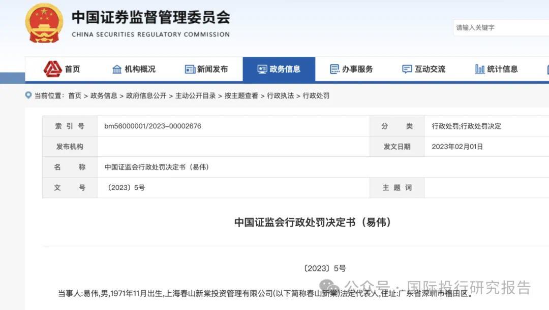 2 、有意思的是,2023 年,中国证监会行政处罚决定书(易伟)〔2023〕5号,也有一份易伟的处罚书。当时,大 V“易伟 因”操纵三夫户外2023 年被证监会没收、处罚款项共计9988万元。
