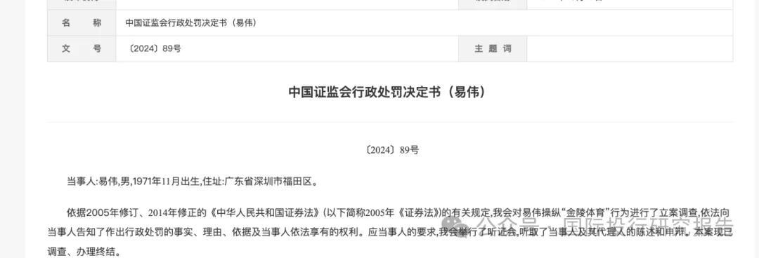 二个易伟操纵股市:易伟操纵金陵体育被证监会处罚 1.668 亿,同年同月生大 V“易伟”操纵三夫户外2023 年被证监会处罚9988万元