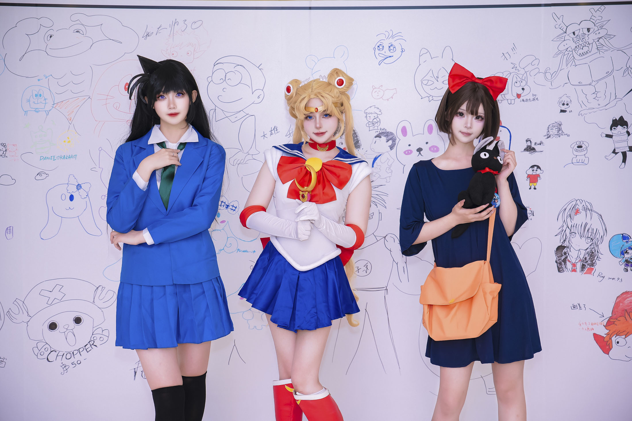 手绘墙附近的coser毛利兰(左)、月野兔(中)、琪琪(右)。