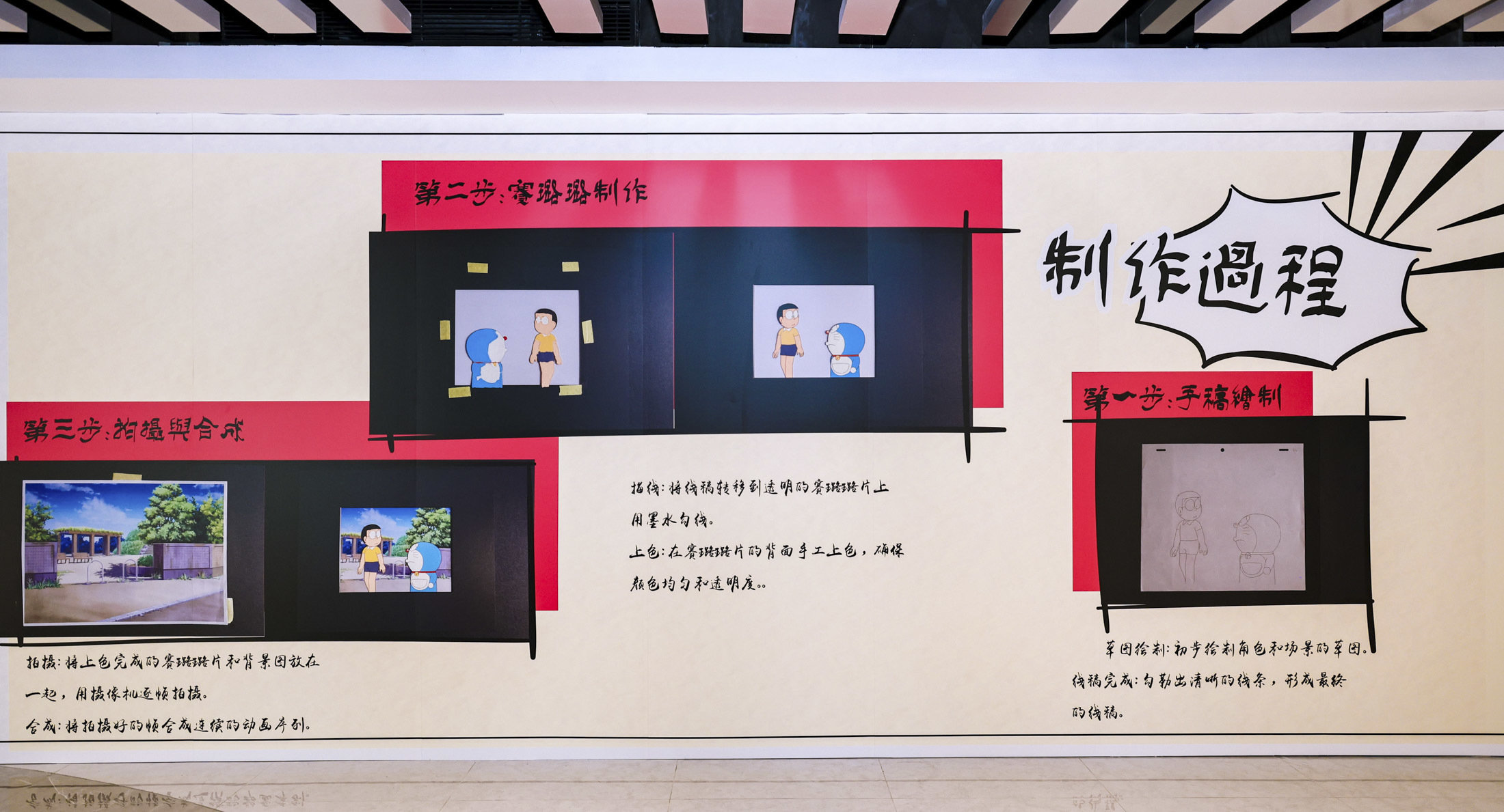 在展会的入口和出口,分别有两块版面图文并茂,介绍什么是手稿、什么是赛璐璐、手稿和赛璐璐在动画制作过程中扮演怎样的角色。有不少观众驻足此处阅读,这些科普知识让他们对动画艺术有了更进一步的了解,同时加深了和心仪作品间的联系。