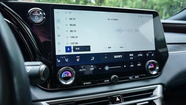 雷克萨斯RX450h+的可视屏幕一共有三处,一为抬头显示,它不仅可以显示时速、挡位以及辅助驾驶的相关信息(如限速标识、车道线等),还可以通过方向盘按键操作,投屏声音、空调、辅助驾驶、抬头显示调节等按键,并进行操作。这是RX系列,包括其纯电RZ最为独特的升级。