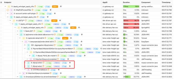 此处只是使用了 IAST 的插桩原理,并未部署 IAST。CI 的监控系统运行比较稳定,插桩覆盖率也比较高,也有 traceid 可以做全链路的追踪。如图12是一个完整的链路信息,包含埋点的调用堆栈、执行的 SQL。