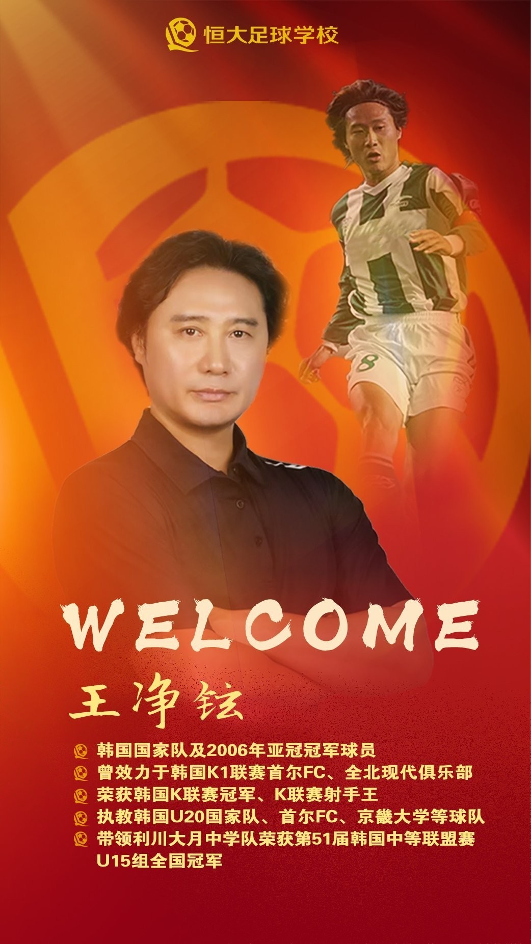 恒大足校官方写道:“欢迎韩国籍教练王净铉指导加入恒大足球学校~