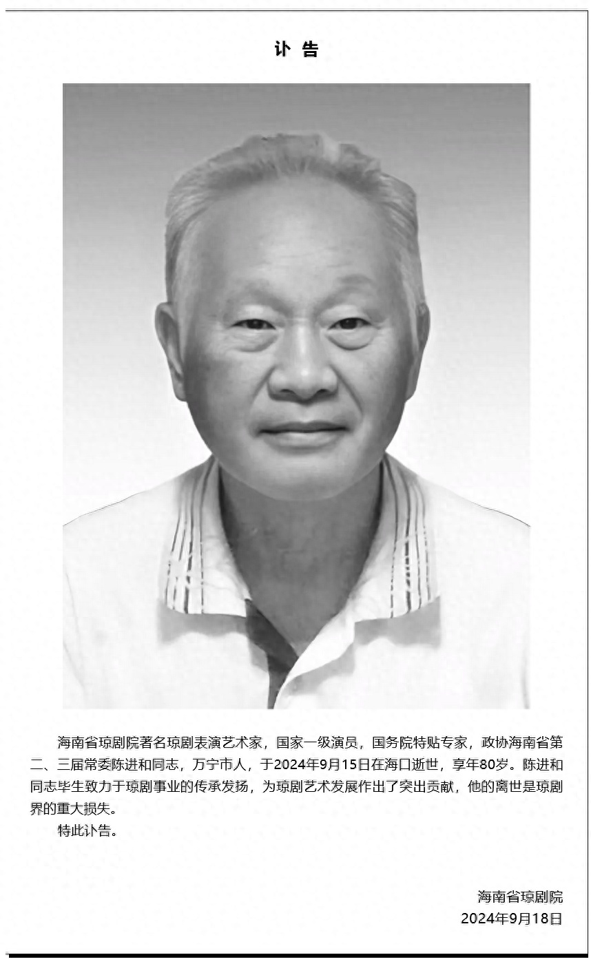 9月18日,海南省琼剧院官微发布讣告,沉重悼念陈进和同志。