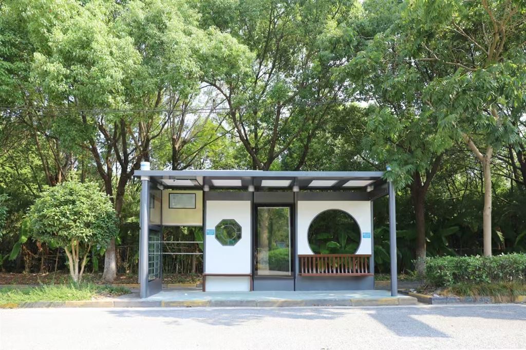 位于张堰镇康德路张漕路,新建候车亭设有木质座椅、遮阳棚、公交电子信息屏幕,在繁盛的绿荫映衬下,增添了推窗见绿、古朴雅致的美感。
