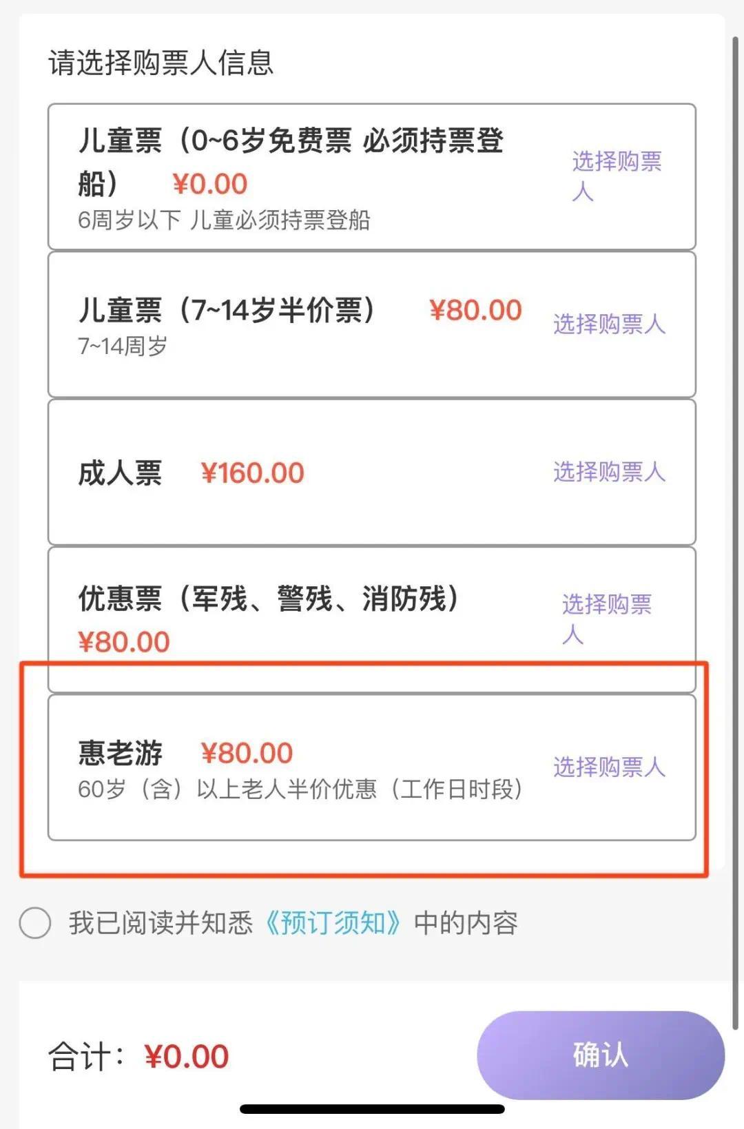 “购票时进入票种选择界面,先选择票种类型,60周岁(含)以上的客人选择‘惠老游’福利票即可。”苏州河游船相关负责人提示道,登船时需携带身份证或其他可证明年龄的证件,登船时核验身份证名字需要一致。