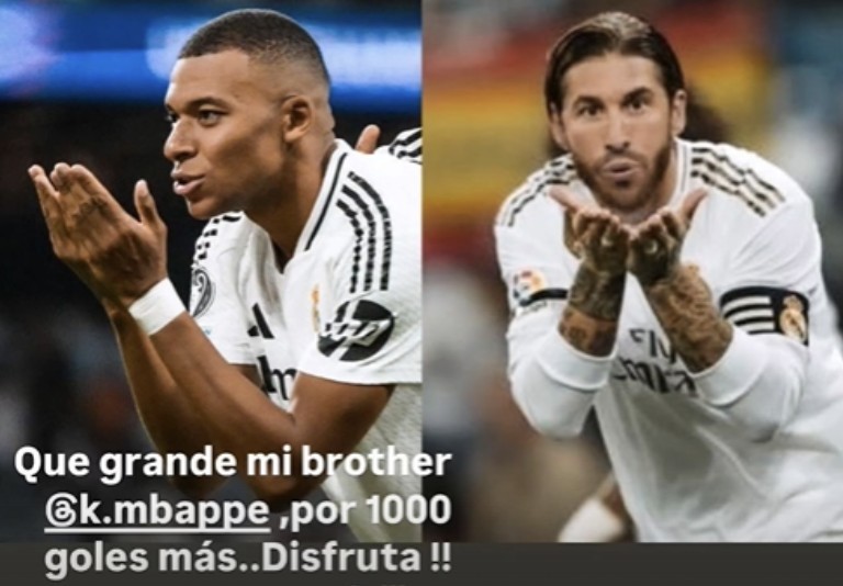 姆巴佩在代表皇家马德里打入首粒欧冠进球后模仿了拉莫斯的庆祝动作,今日拉莫斯在个人社交媒体上发文写道:“我的兄弟太棒了!再进1000个球吧,好好享受!”