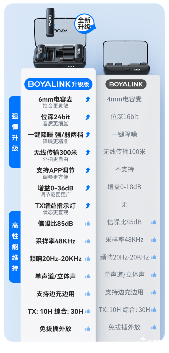 BOYALINK无线领夹麦克风仅百元的价格就能满足一键降噪、CD级音质、多设备可用、一盒收纳、免插拔回放、30小时续航,能满足直播、采访、volg等等大多数的场景使用需求。再加上安卓和苹果设备都能使用、可以拥有立体声的录制,可以让创作者更无拘无束的进行创作,为录制过程提供更有利的帮助。相比于前一代产品,BOYALINK无线领夹麦克风的升级点也是更多了,可以说是创作者必备的百元无线麦克风。目前BOYALINK无线领夹麦克风正在官方售卖中,需要一款专业无线麦的朋友可以到博雅官方了解。