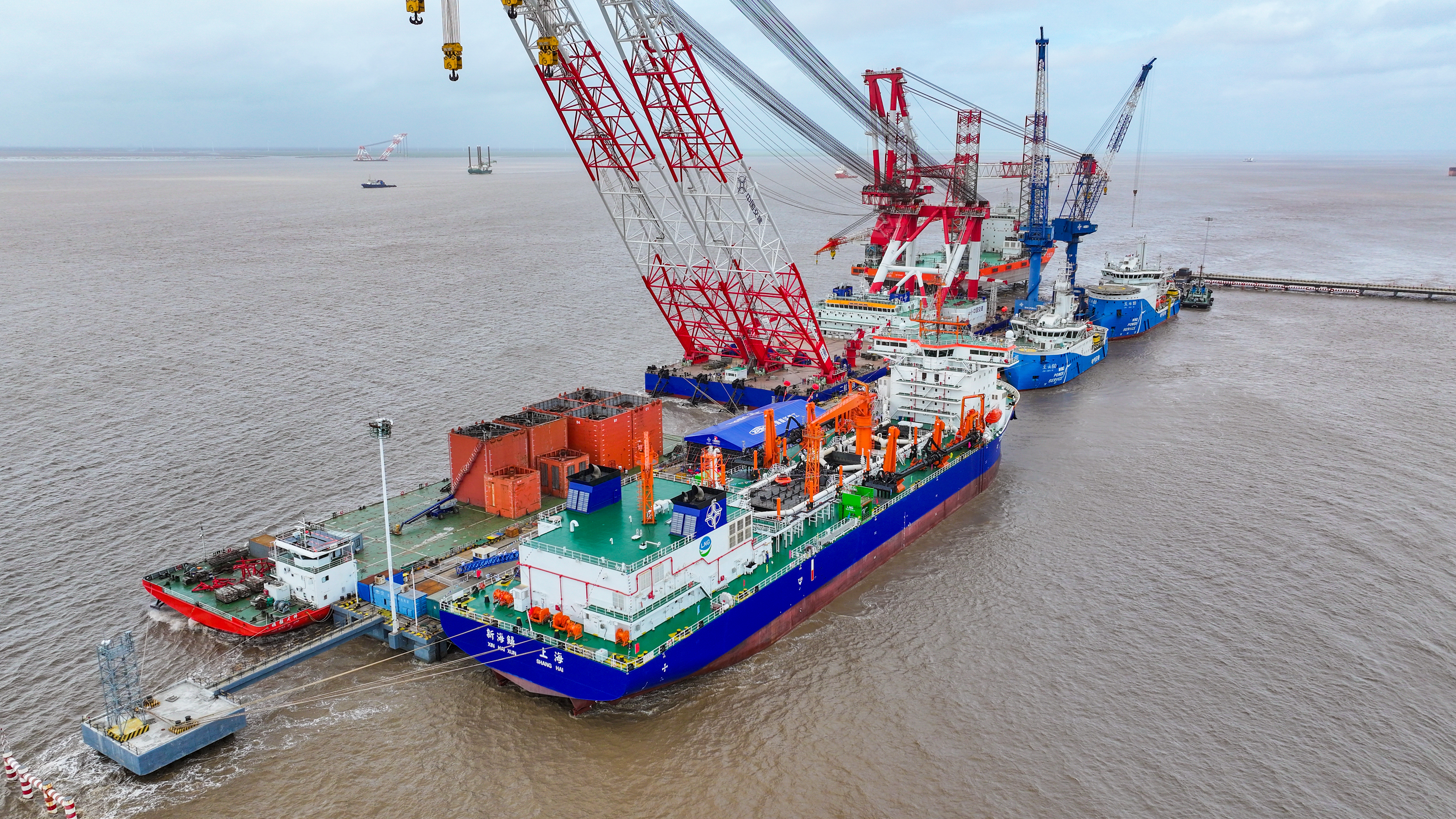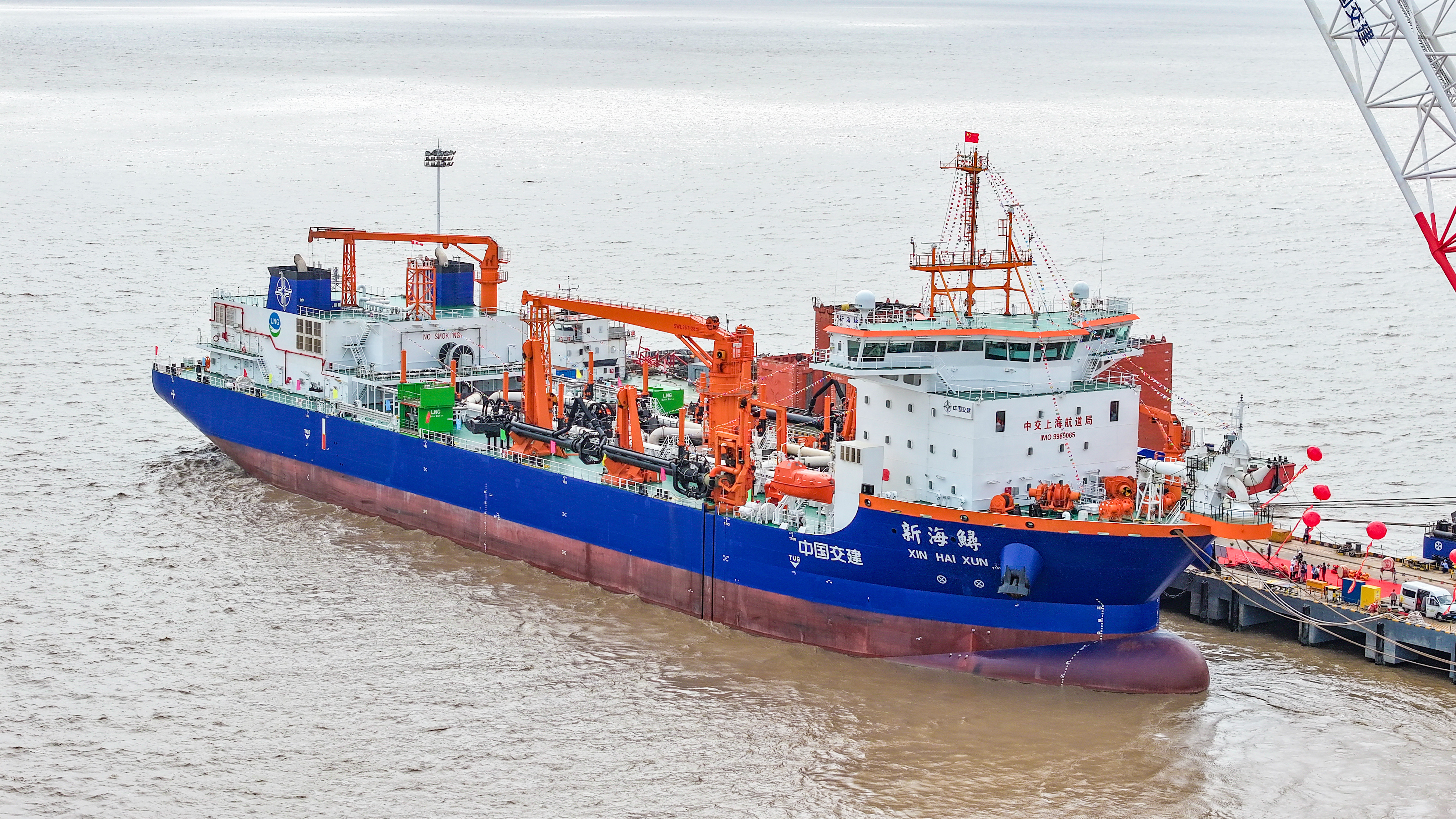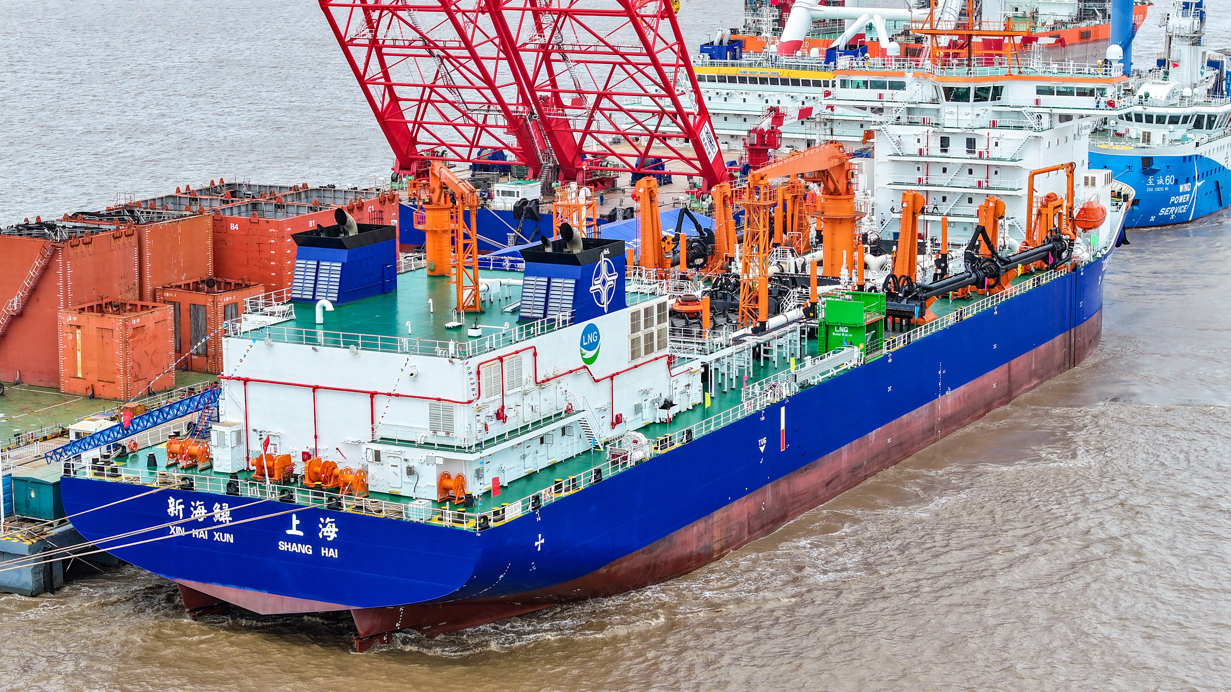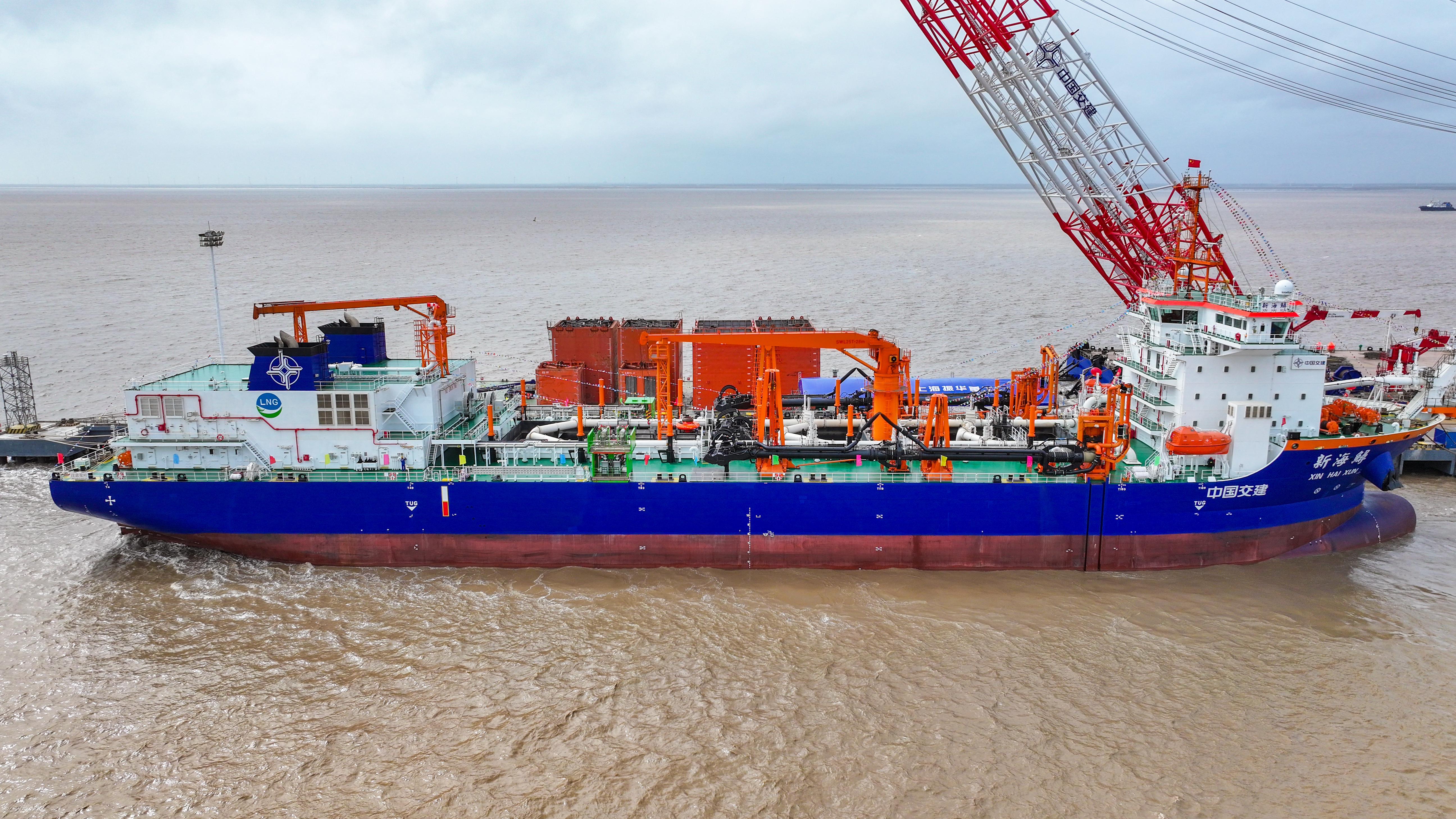 “新海鲟”轮是目前全球最大、国内首艘采用LNG双燃料动力的大型耙吸式挖泥船,该船总长155.7米、型宽32米、型深13.5米,设计泥舱最大舱容16808立方米,配置1550立方LNG双耳罐。