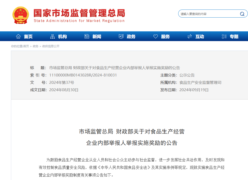 红星资本局9月19日消息,今日,国家市场监督管理总局官网发布《市场监管总局 财政部关于对食品生产经营企业内部举报人举报实施奖励的公告》(以下简称“公告”)。