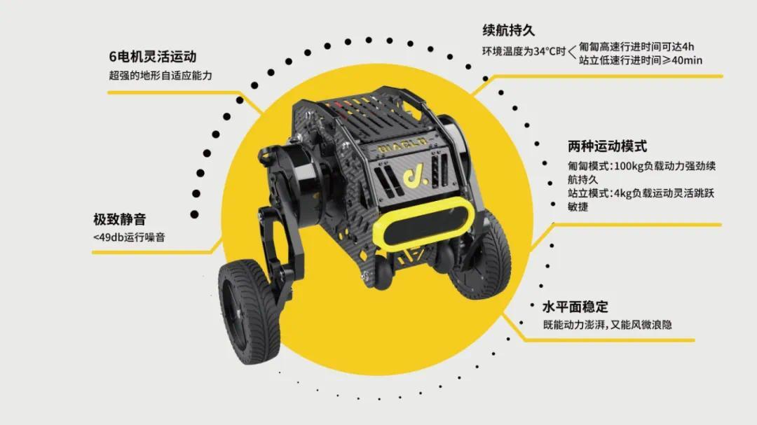 这款机器人将轮式 AGV 的速度优势和足式机器人的机动越障性能结合,以及独特的变形功能让机器人兼顾足式机器人的灵巧与轮式机器人的稳健迅捷,可以使其在多地形下高效、灵活地运动。