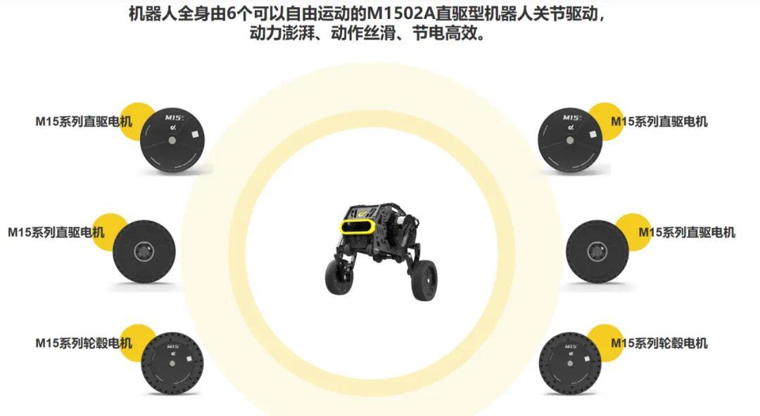 机器人全身由 6 个可以自由运动的 M1502D直驱型机器人关节驱动,动力澎湃、动作丝滑、节电高效。