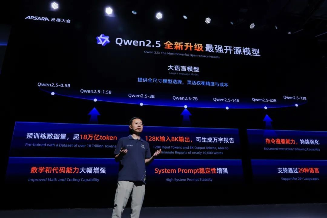 在今天的云栖大会,阿里云 CTO 周靖人发布通义千问新一代开源模型 Qwen2.5,旗舰模型 Qwen2.5-72B 性能超越 Llama 405B,再登全球开源大模型王座。