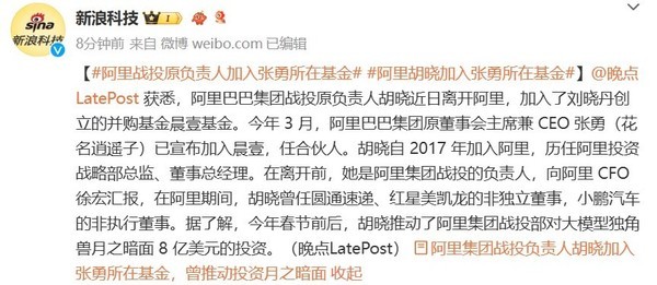 9月19日,据@晚点LatePost 报道,阿里巴巴集团战投原负责人胡晓近日离开了阿里巴巴,转而加入了由刘晓丹创立的并购基金——晨壹基金。这一人事变动引起了业界的关注。