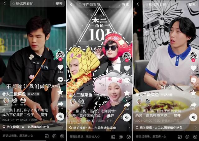 7月底,太二酸菜鱼推出“酸爽剧场”,打造品牌首部定制短剧《实习霸总狂宠卖鱼妹》。剧中为鱼进行五星级SPA按摩,每条鱼都带着爱意出锅等剧情不仅成为了网络新梗,更传递了太二“年轻、好玩、有趣”的品牌理念。