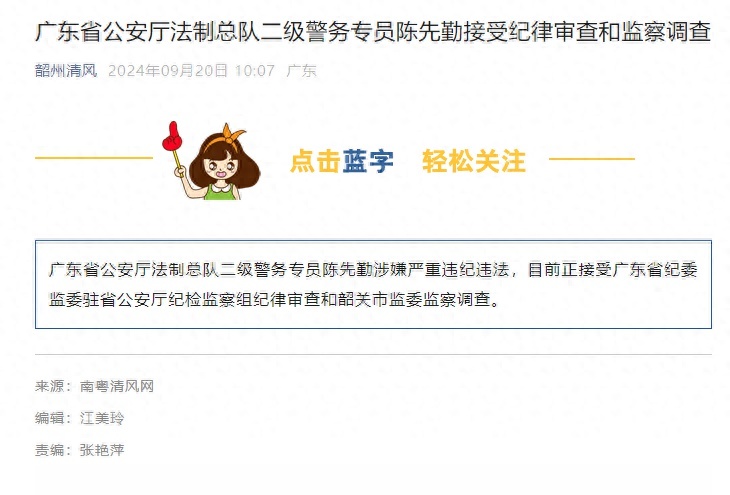 9月20日,据南粤清风,广东省公安厅法制总队二级警务专员陈先勤涉嫌严重违纪违法,目前正接受广东省纪委监委驻省公安厅纪检监察组纪律审查和韶关市监委监察调查。