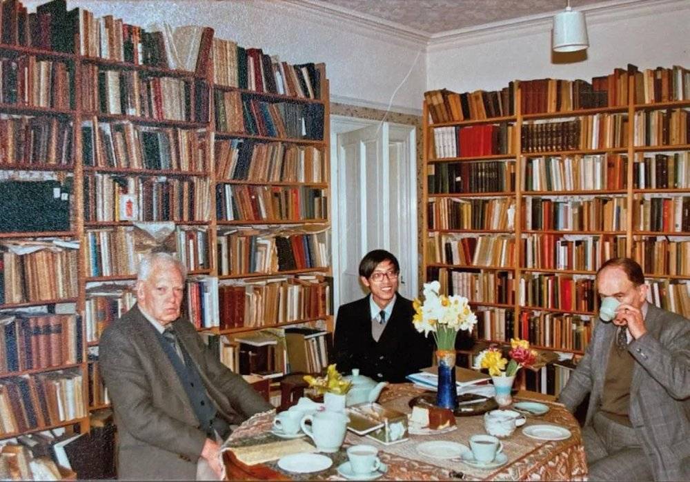 1985年,荣新江(中)在英国与贝利(左)及其助手合影。(图/受访者提供)