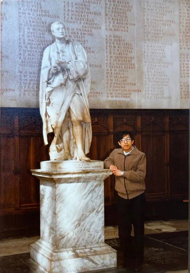 1985年,荣新江在剑桥牛顿塑像前留影。(图/受访者提供)