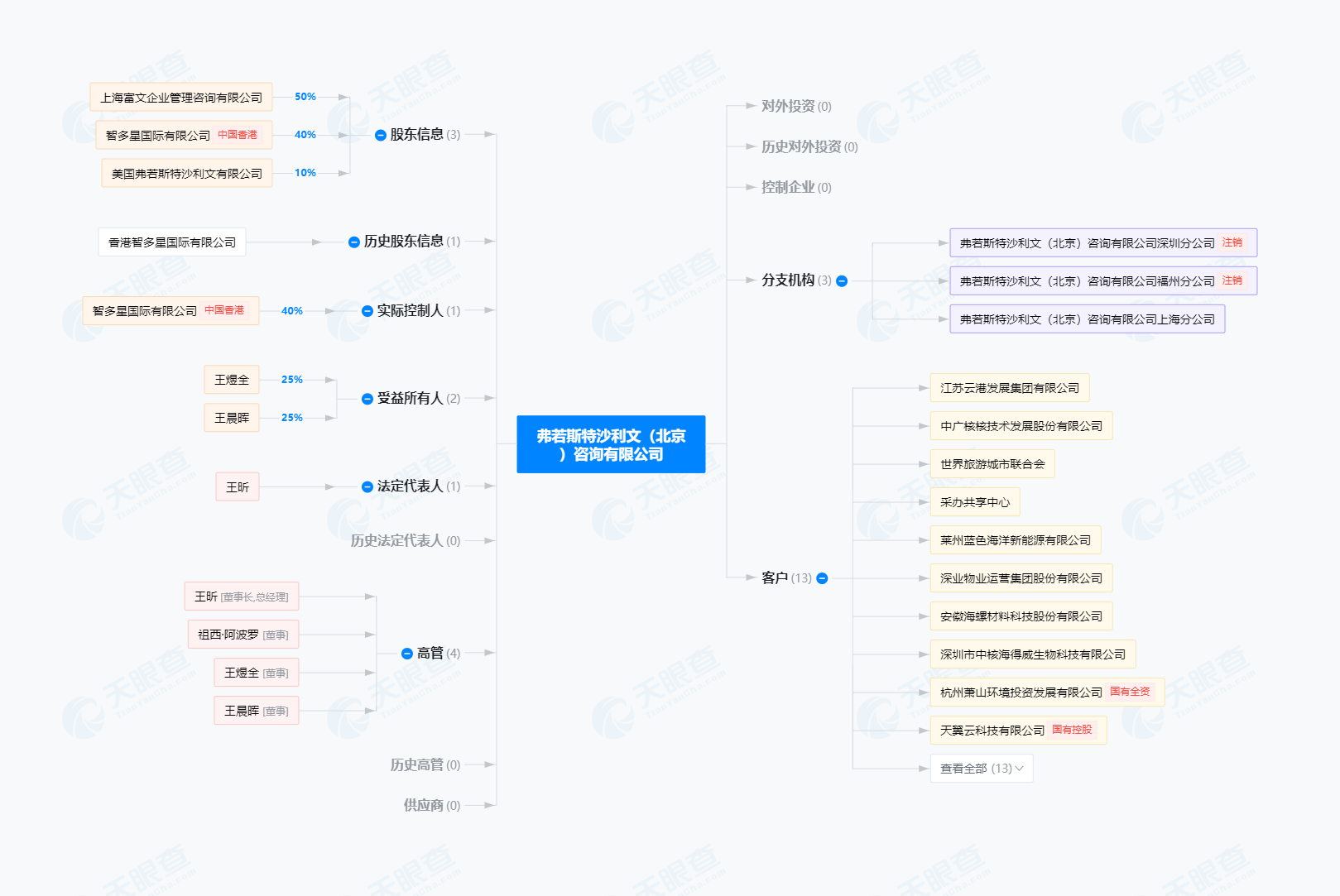 天眼查信息显示,弗若斯特沙利文(北京)咨询有限公司实际成立时间为2003年,注册资本30万美元,法定代表人为王昕,王昕同时也是公司董事兼总经理。沙利文北京最大股东是上海富文企业管理咨询有限公司,持股50%,该公司由王煜全和王晨晖两位自然人股东各持50%股份。另外的40%股权由智多星国际有限公司(中国香港)持有、美国弗若斯特沙利文有限公司则占股10%。