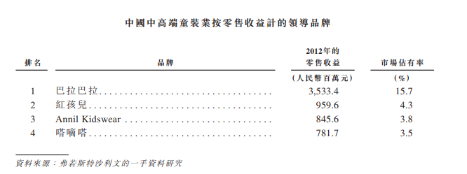 然而,博士蛙的招股书显示,根据弗若斯特沙利文的2009年数据,博士蛙被列为中高端儿童服装市场的前十名品牌之一,排名第一,销售额为5.69亿元,占市场份额的7.7%。