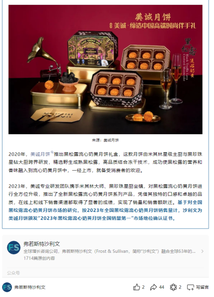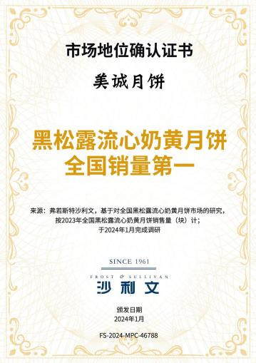 随着舆论不断发酵,美诚月饼的产地、质量等诸多细节陆续遭到质疑。据媒体报道,小杨哥在直播间还晒出过美诚月饼的一份“市场地位确认证书”。证书上显示2024年1月,该品牌的黑松露流心奶黄月饼全国销量第一,而其颁发人则为沙利文。随着“美诚月饼”翻车,沙利文的认证引发了公众对其权威性与公正性的广泛质疑。