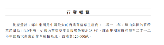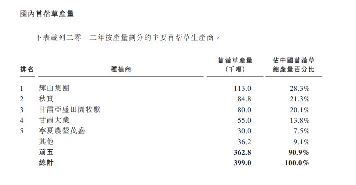 根据沙利文为辉山乳业编制的报告,“按产量计,辉山集团是中国最大的商业苜蓿草生产商。二零一二年,辉山集团的苜蓿草产量为113,000吨,占国内苜蓿草产量市场份额约28.3%。辉山集团亦拥有截至二零一二年中国最大商业苜蓿草种植基地,面积为120,000亩。”