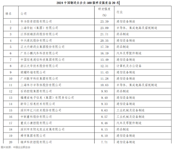 9月20日,中国企业联合会、中国企业家协会在合肥举办的2024世界制造业大会上发布了2024中国制造业企业500强榜单,这是中国企业联合会连续第20次向社会发布该项榜单。同时,此次也公布了中国制造业企业500强研发强度排名。
