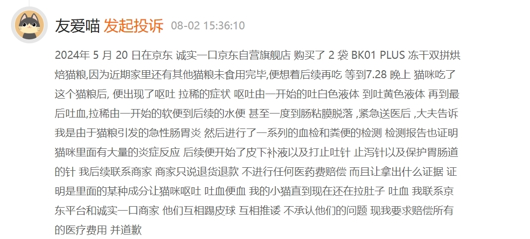 该消费者后续联系诚实一口京东客服,商家只说退货退款,不进行任何医药费赔偿。而且让拿出证据,证明是里面的某种成分让猫咪呕吐、吐血、便血。消费者称,自己要求商家赔偿所有的医疗费用并道歉。