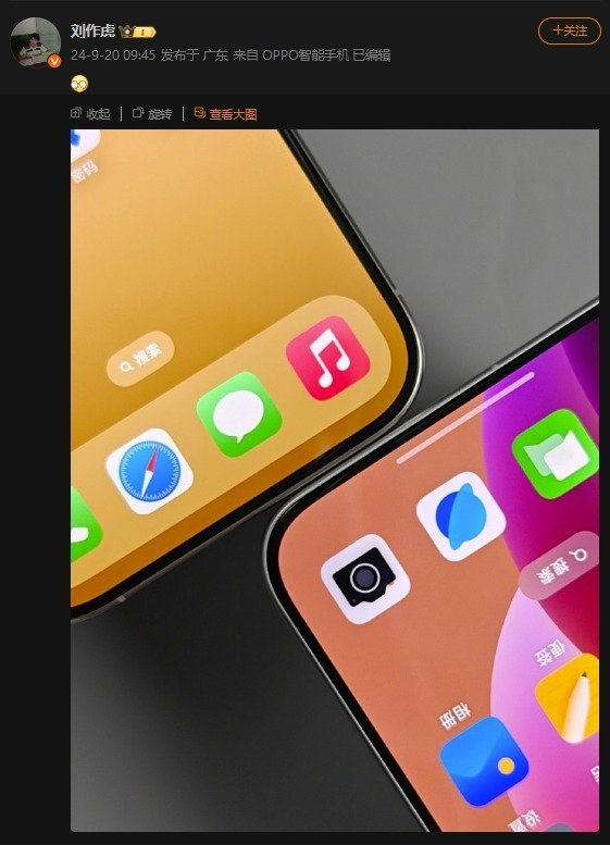 9 月 20 日消息,今日 OPPO 首席产品官刘作虎放出一张手机屏幕对比图,结合此前信息来看,这款手机大概率为 OPPO Find X8。而对比手机为今日正式发售的 iPhone 16 Pro 系列。