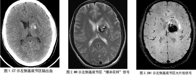 放射医学中心医师阅CT片后认为要除外血管性病变合并出血(海绵状血管瘤并出血)的可能(图1),进一步MR检查显示了左侧基底节区“爆米花”样混杂信号(图2),SWI(磁敏感)示左侧基底节区多发小点状、片状出血低信号(图3),明确了海绵状血管瘤的诊断。