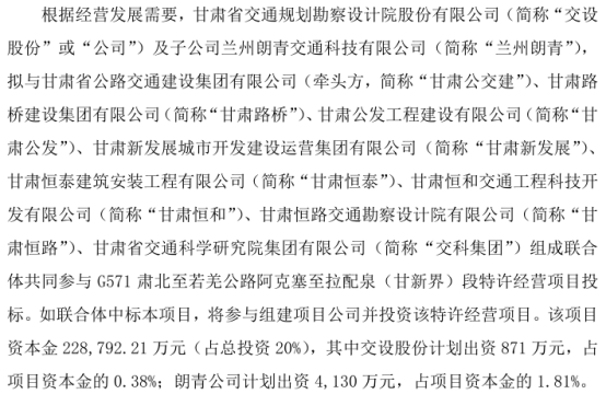 挖贝网9月20日,交设股份(872665)近日发布公告,根据经营发展需要,甘肃省交通规划勘察设计院股份有限公司(简称“交设股份”或“公司”)及子公司兰州朗青交通科技有限公司(简称“兰州朗青”),拟与甘肃省公路交通建设集团有限公司(牵头方,简称“甘肃公交建”)、甘肃路桥建设集团有限公司(简称“甘肃路桥”)、甘肃公发工程建设有限公司(简称“甘肃公发”)、甘肃新发展城市开发建设运营集团有限公司(简称“甘肃新发展”)、甘肃恒泰建筑安装工程有限公司(简称“甘肃恒泰”)、甘肃恒和交通工程科技开发有限公司(简称“甘肃恒和”)、甘肃恒路交通勘察设计院有限公司(简称“甘肃恒路”)、甘肃省交通科学研究院集团有限公司(简称“交科集团”)组成联合体共同参与G571肃北至若羌公路阿克塞至拉配泉(甘新界)段特许经营项目投标。如联合体中标本项目,将参与组建项目公司并投资该特许经营项目。该项目资本金228,792.21万元(占总投资20%),其中交设股份计划出资871万元,占项目资本金的0.38%;朗青公司计划出资4,130万元,占项目资本金的1.81%。