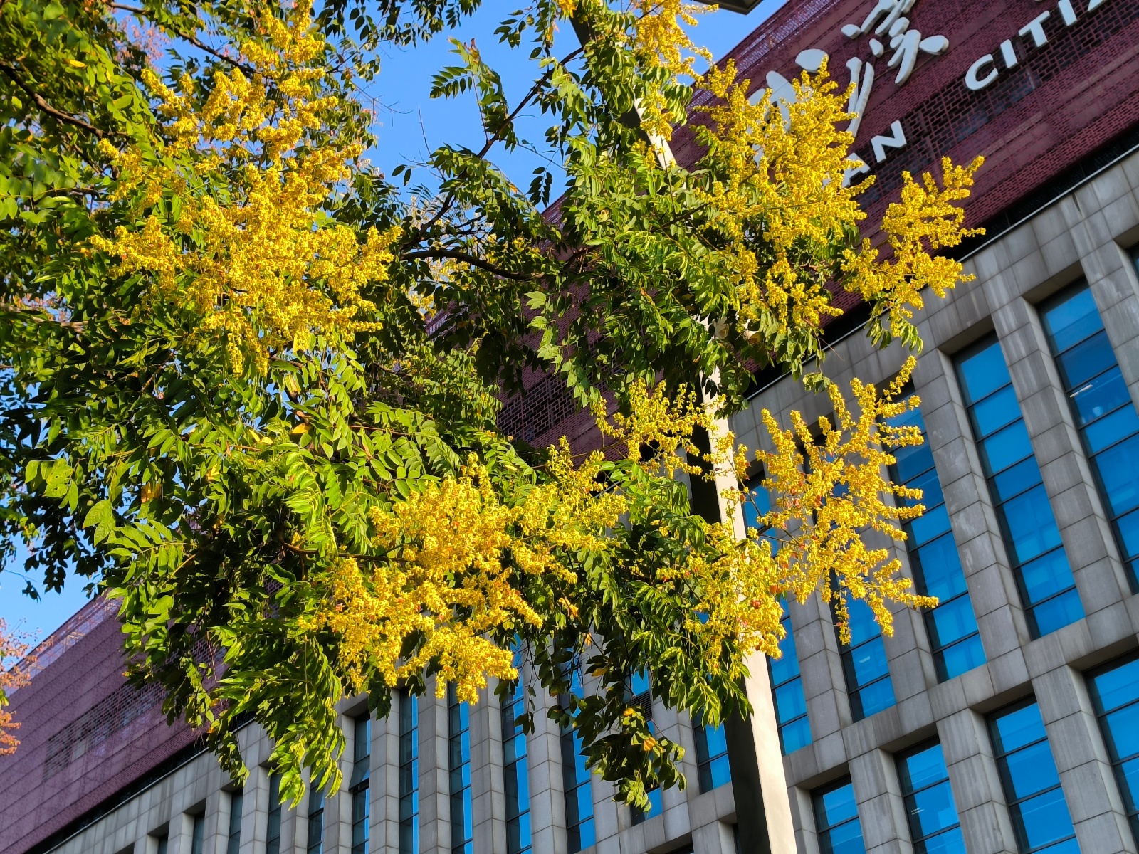 九月以来,伴随着天气转凉,武汉街头的栾树也进入盛花期。金黄色的小花挂满枝头,微风一吹,满地黄花,有的树枝上还结出红色的果实,为武汉的秋天增添了几分独特的韵味。