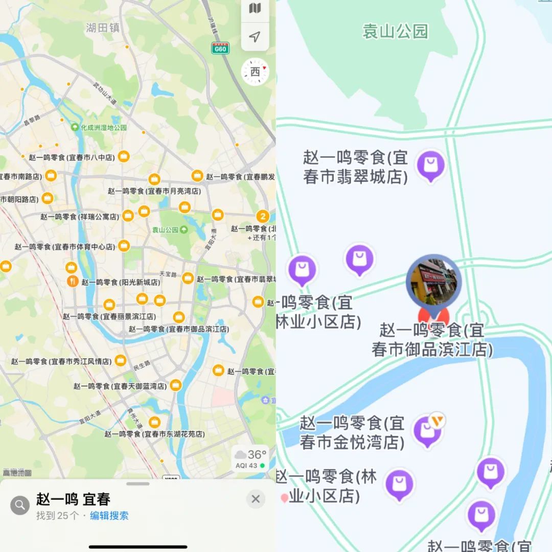 苹果手机地图显示,宜春至少有超过25家赵一鸣门店。