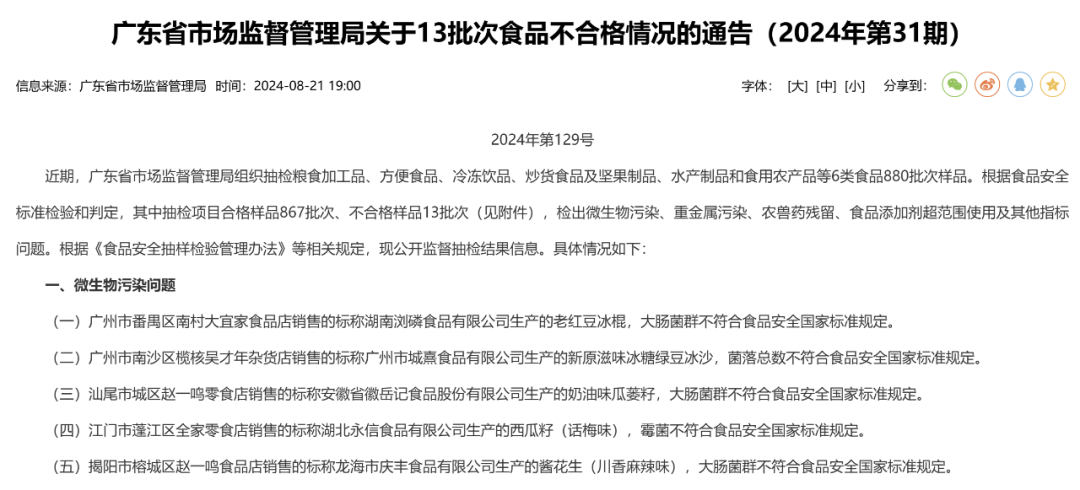 就在不久前,根据广东省市场监管局的通告,汕尾市城区赵一鸣零食店销售的奶油味瓜蒌籽、揭阳市榕城区赵一鸣食品店销售的酱花生(川香麻辣味),这2批次样品都被检出大肠菌群超标。