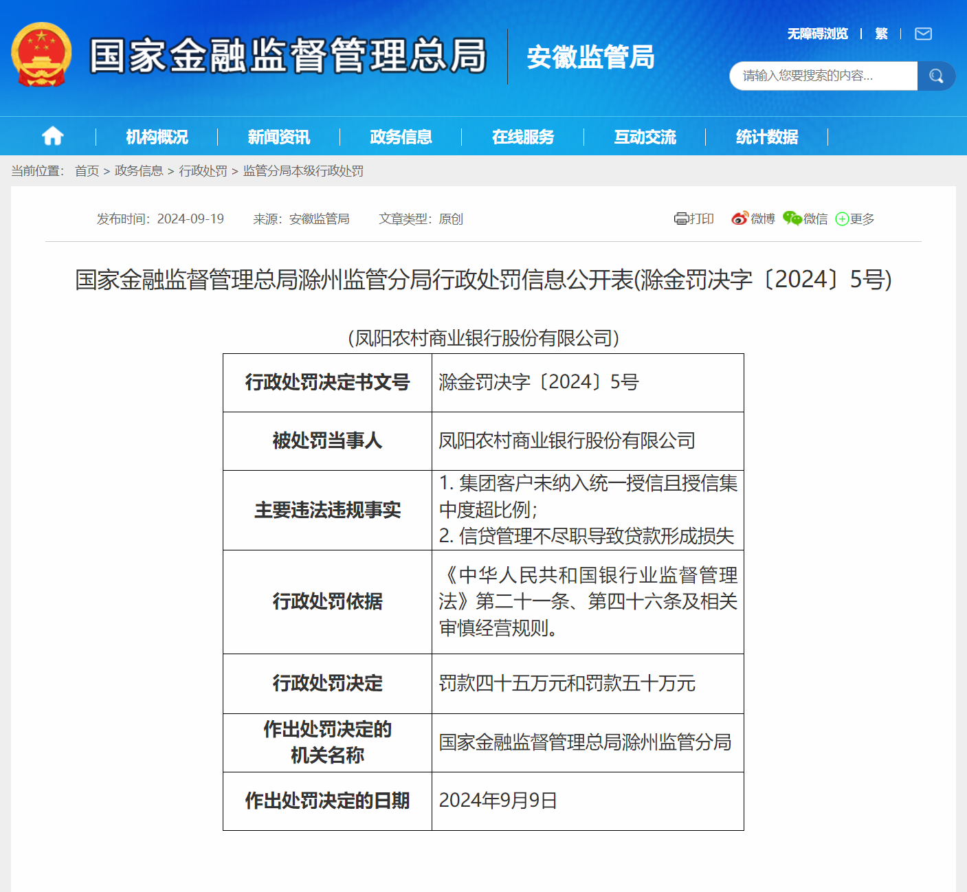 据安徽监管局近日披露行政处罚信息,因存两大违法违规事实,安徽凤阳农村商业银行股份有限公司(简称“安徽凤阳农商行”)分别被罚款45万和50万。行政处罚决定书文号为滁金罚决字〔2024〕5号。