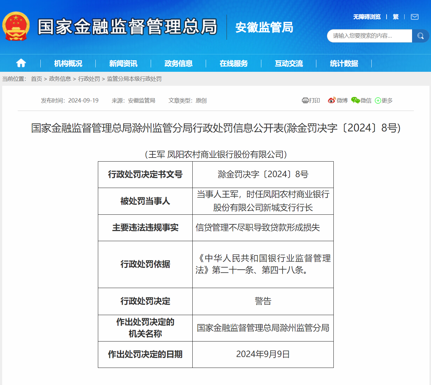 时任凤阳农村商业银行股份有限公司新城支行行长王军,信贷管理不尽职导致贷款形成损失,被警告处分。